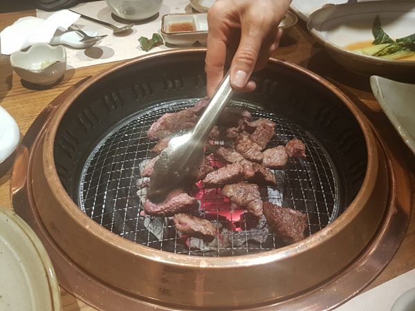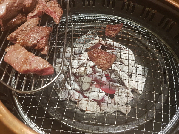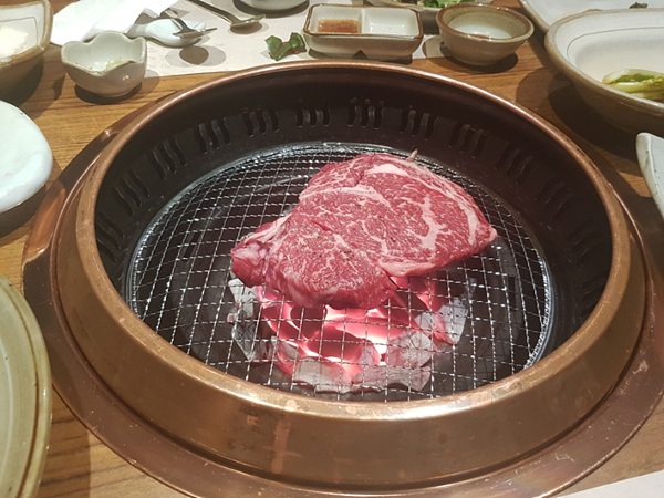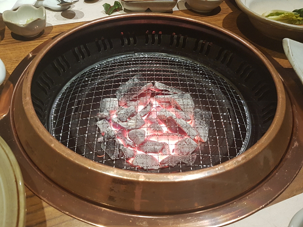 화로에 숯을 올리고 불을 올려줍니다. 1++ 생등심을 서버분이 맛있게 직접 구워줍니다.