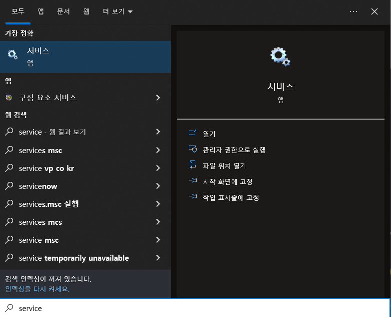 1. 윈도우키를 누른 후 영문으로 service를 입력해 주세요. 서비스 앱이 검색되면 실행해 주세요.
