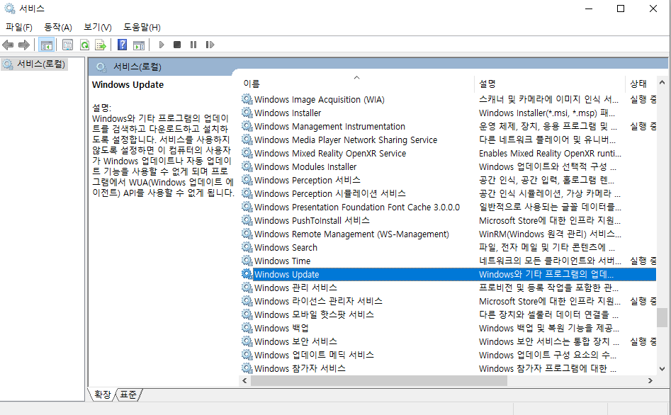 2. 이름 부분에 있는 항목 아무거나 선택 후 W를 누른 후 Windows Update 항목을 찾아주세요.