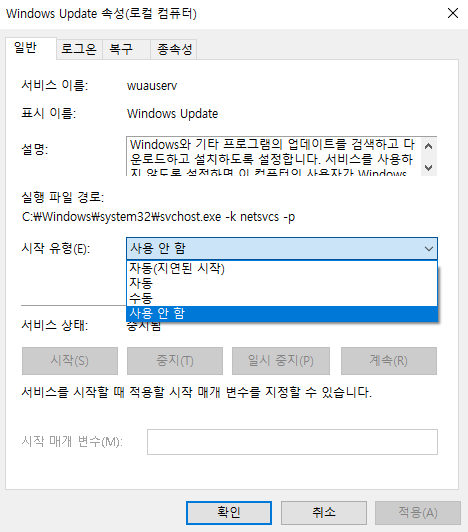 업데이트를 다시 사용하기 원한다면 시작 유형을 자동으로 선택 후 서비스 상태를 시작하고 적용을 누른 후 확인을 눌러주시면 완료됩니다.