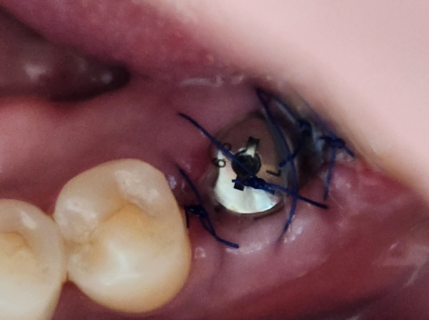 드릴로 잇몸뼈에 픽스쳐가 들어갈 구멍을 뚫고 픽스쳐를 삽입 후 뼈이식을 한 후 잇몸을 봉합하고 수술을 끝냈습니다.